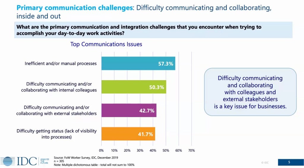 But in the opening session with Richard Jefts and Wayne Kurtzman – IDC Research Director Social & Collaboration – very interesting informations about “Enabling the Future of Work” have been given. Especially the slide about the difficulties in communication and collaboration was very interesting: