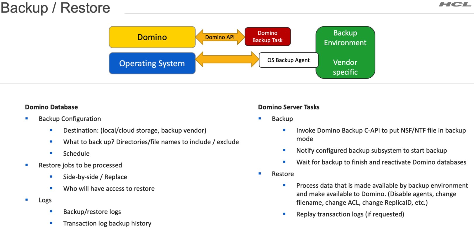 There´s no change with existing backup solutions. You can find details for the included backup here: https://help.hcltechsw.com/domino/12.0.0/admin/admn_backupandrestore.html
