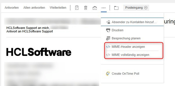 With the latest release of HCL Verse on premises it’s possible to get the MIME header and the complete MIME information of an email: